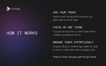 Focusly to darmowe rozszerzenie do Chrome, zaprojektowane w celu zwiększenia produktywności poprzez promowanie skoncentrowanego podejścia do zarządzania zadaniami. Umożliwia użytkownikom skupienie się na jednym zadaniu na raz, skutecznie przerywając bałagan tradycyjnych list zadań. To minimalistyczne narzędzie upraszcza procesy robocze, ułatwiając zarządzanie zadaniami bez uczucia przytłoczenia.